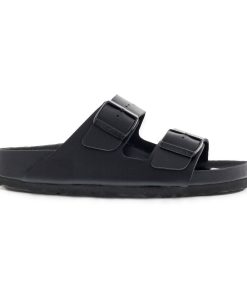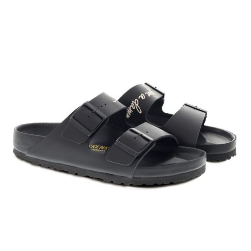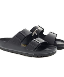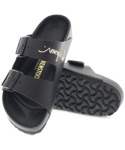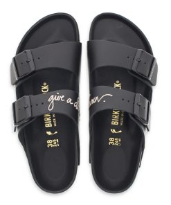BIRKENSTOCK® x Lingua Franca. The New York luxury brand brings its timeless “Give a Damn” message to limited edition Arizona sandals. The brand’s signature script embroidery makes a statement across each strap so you can take that spirit with you. Smooth leather footbed linings add a luxe touch below, grounding you in legendary comfort. Tonal soles and buckles refine the details.