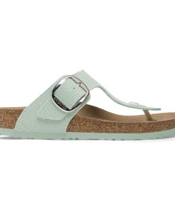 - Thong style with oversized metal pin buckle