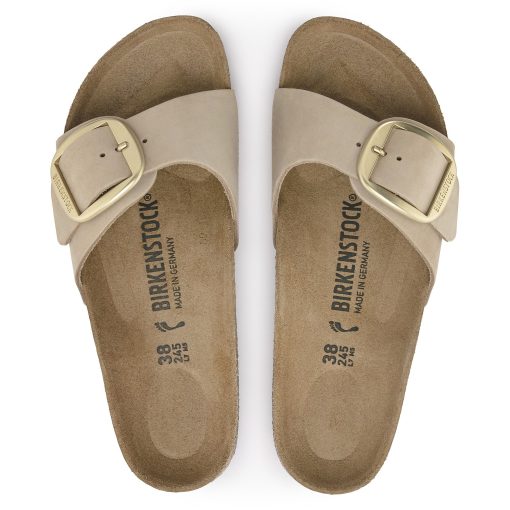 An icon since 1963, the Madrid sandal redefined the slip-on look with a single strap. This season, soft nubuck leather pairs perfectly with a big, gold matte buckle—sized up to make a statement Complete with go-all-day comfort from an original contoured BIRKENSTOCK footbed.