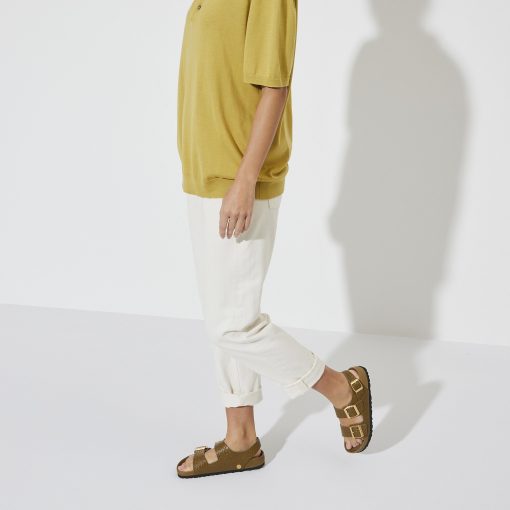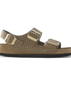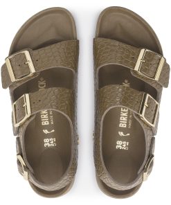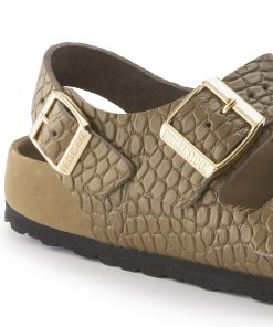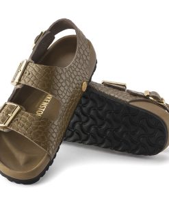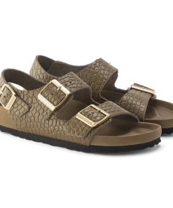 The BIRKENSTOCK Milano now features a reptile leather look and feel and a compact design with an ankle strap. The metal pin buckles are individually adjustable with color-coordinated detailing. The exquisite footbed is fully lined with soft piumato leather, making it exceptionally comfortable. The upper is made from embossed natural leather.