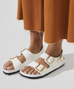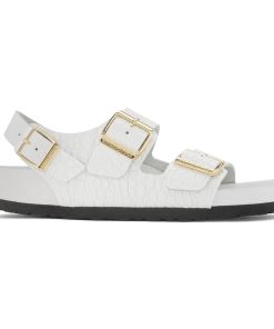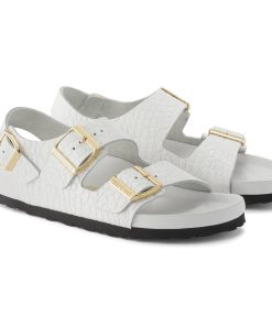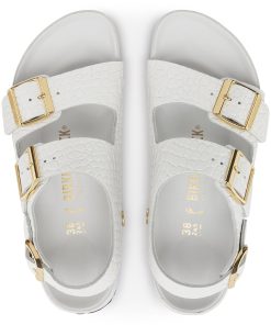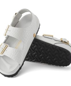 The BIRKENSTOCK Milano now features a reptile leather look and feel and a compact design with an ankle strap. The metal pin buckles are individually adjustable with color-coordinated detailing. The exquisite footbed is fully lined with soft piumato leather, making it exceptionally comfortable. The upper is made from embossed natural leather.
